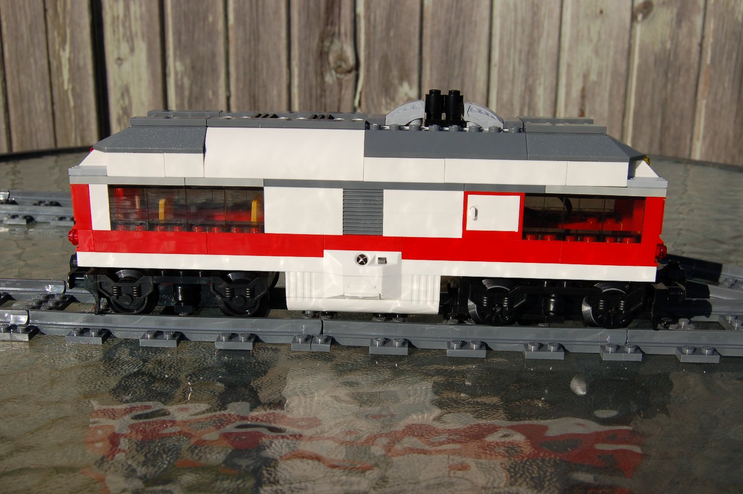 I didn't like the unflexible fixed formation of the ICE passenger train. Instead I build two identical passenger coaches and a diesel railcar with passenger accommodation. Although verry different from the ICE-powercar the family resemblance is obvious.
